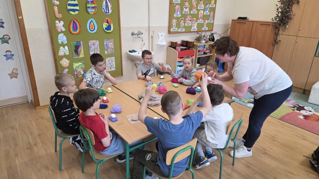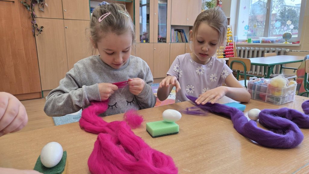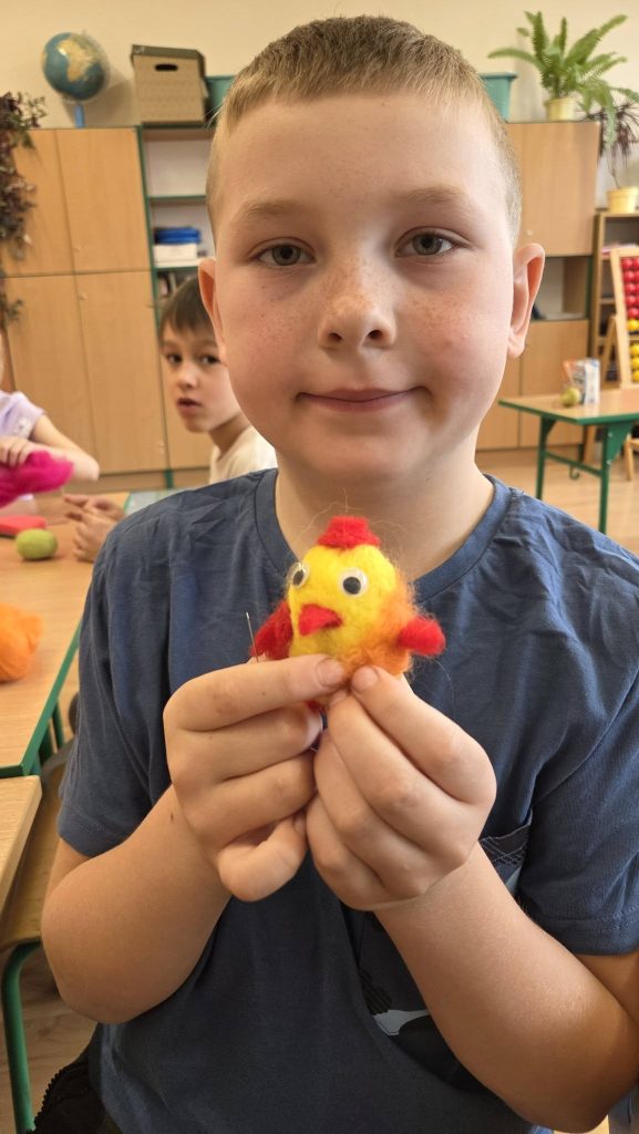 Równie twórczo czas spędzili uczniowie klasy pierwszej i drugiej, którzy mieli okazję uczestniczyć w wyjątkowych warsztatach. Naszym gościem była pani Ewa Bącal – mama Diany, która zaprezentowała dzieciom niezwykłą technikę tworzenia pisanek metodą filcowania na sucho. Uczniowie z zaciekawieniem poznawali kolejne etapy pracy i z dumą wykonywali własne, niepowtarzalne ozdoby.